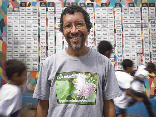 O professor de biologia Luiz Henrique Rosa em frente ao muro decorado por alunos da Escola Municipal Herbert Moses com cerca de 200 nomes de escravos (Foto: Paula Giolito)